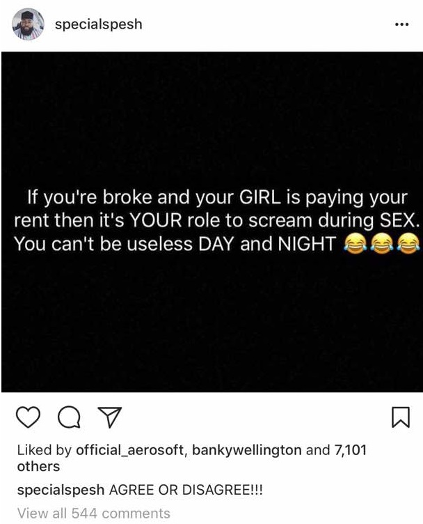 He wrote on his Instagram; “If you’re broke and your Girl is paying your rent. then it’s YOUR role to scream during s-ex. You can’t be useless DAY and NIGHT.”